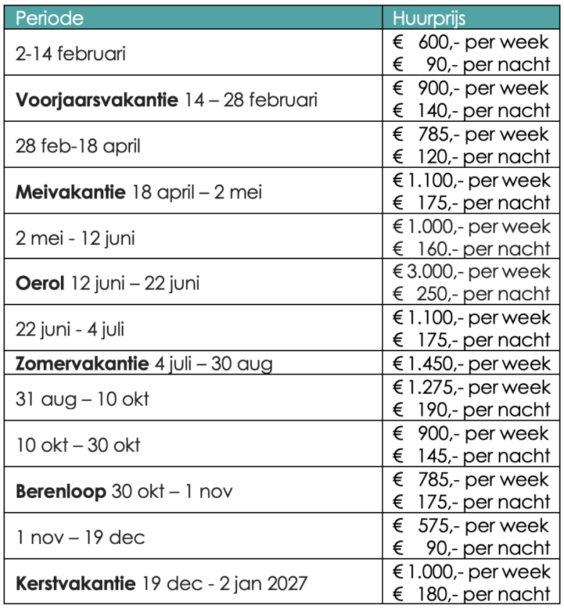 Via onderstaande link vind je de actuele prijzen voor 2026 Overzichtelijk gepresenteerd en per (vakantie)periode,